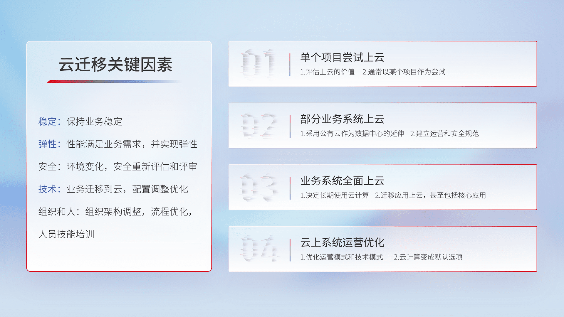 结合实际业务,,,,从规划设计、、、云平台选型、、、云原生改造、、数据迁移、、、集成交付,,,,迁移全过程为客户识别最佳上云路径,,,,做好风险识别管理,,,设计网络架构、、、身份权限、、安全审计合规、、、、操作审计、、、、日志审计、、监控告警策略、、、多站点容灾设计等,,,,对云上基础设施进行整体规划,,,,提升IT治理水平,,,,以满足弹性、、高可用、、、、高性能的需求。。。。